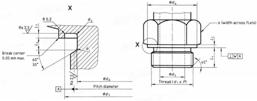 螺纹 d1×P | d5 | d6 | d7 | d8 | L4 | L5 | L6 | L7 | R1 | R2 | s | w | |||